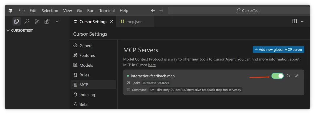 MCP机制:interactive-feedback-mcp 的核心在于,Cursor AI 完成初步指令后,不立即结束主请求,而是通过配置的 MCP(自定义提示服务)弹出交互界面。